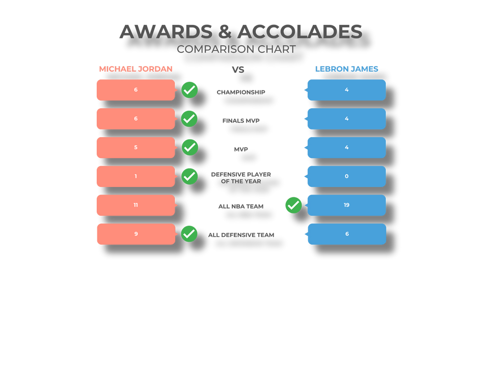 Stats and numbers help us see a player’s level of performance and contribution on the court, but numbers don’t represent greatness, they are just a way to achieve greatness. Numbers compliment accolades, not the other way around. There are plenty of players who have amazing stats, but don’t have the accolades to back those stats up, and because of this they aren’t seen as all-time great players. So now that we’ve seen the stats of Jordan and LeBron, let’s see who has the accomplishments on their side to back them up.