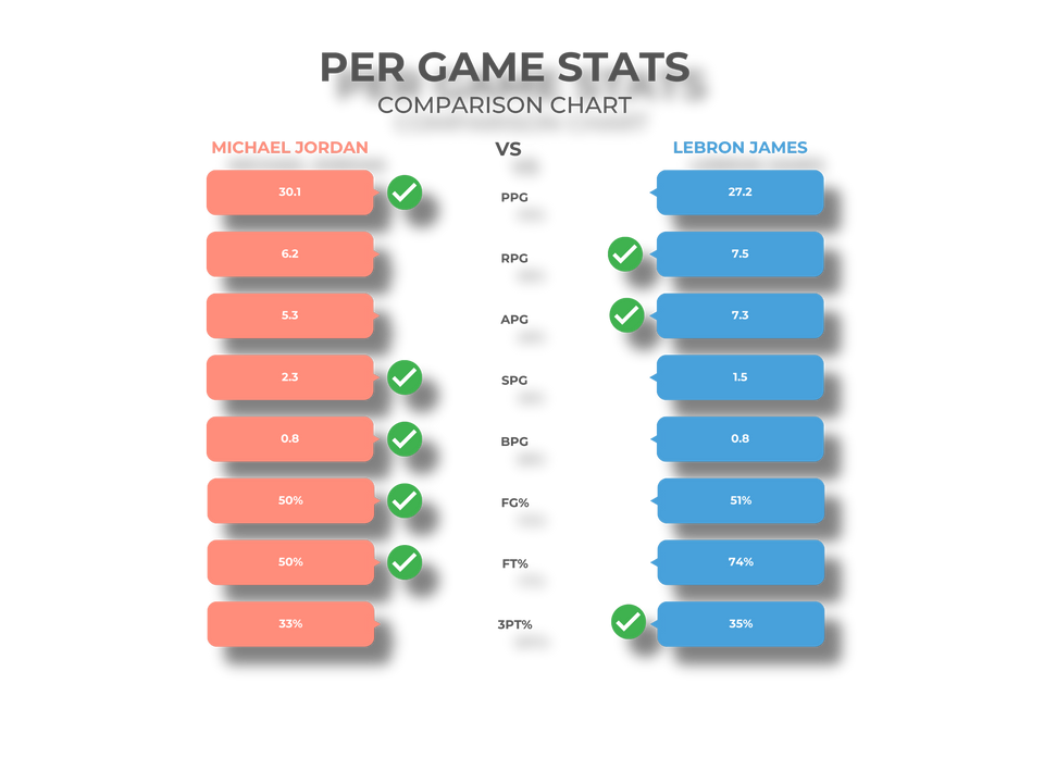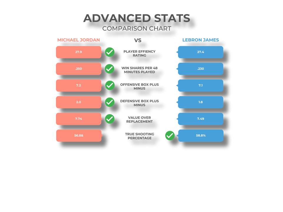 So, if we want to see a better comparison of the two players without having the number of years which they both played be a factor, we can check out their per-game totals. Now we see a whole other side of the story, looking through this lens we can see that although LeBron may have been playing longer than Jordan did when you put their per-game stats next to one another it doesn’t seem close. Still, the debate doesn’t end here, even though it seems like this is it. Most classic GOAT debates between friends, or even on ESPN, end here with these stats, and a comment or two about their final records. But our GOAT debate is different, we’re going to take it a few steps further and instead of just concluding the debate here, we’re going to pull out the advanced stats and more refined arguments to come to our conclusion.